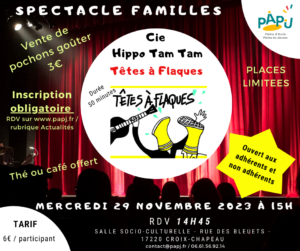 Spectacle Famille : Têtes à flaques Date(s) : - 29 novembre 2023Inscription via le lien suivant : https://forms.gle/UhismkGsEptP1V79A Voir tous les événements